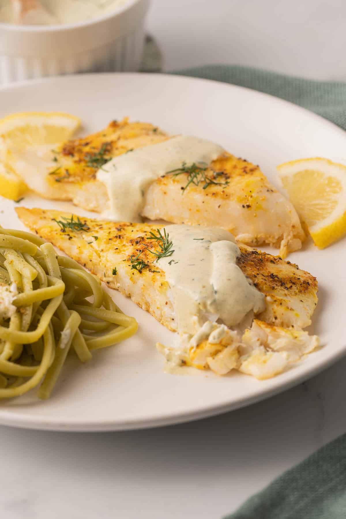 I served the Orange Roughy with spinach Fettuccine with a simple butter herb sauce. I think any pasta would be a good choice as well as some rice or cauliflower rice. Of course if you like a spicy sauce, double the Wasabi Sauce and drizzle over the pasta.