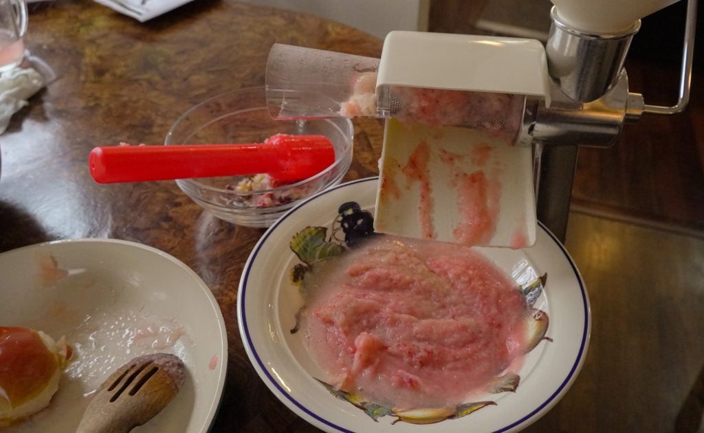 Once it is set up, it is like an assembly line and is pretty easy. My kids used to help me and they thought it was a fun project. I put two cooked apples at a time in the funnel and crank away. The applesauce comes down the strainer and the skin and seeds goes down the other.