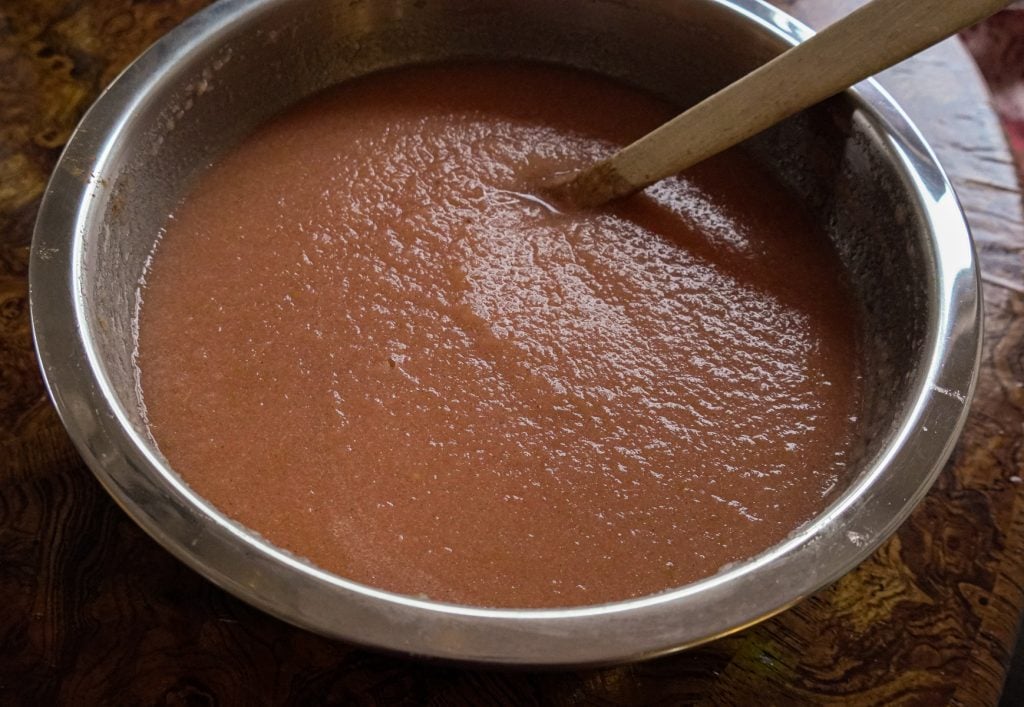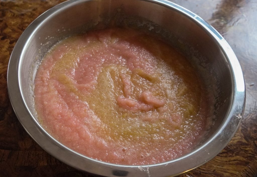 This is the applesauce straight out of the strainer. Nothing has been added. The color depends on the type of apples. The macouns I used happened to be dark red so it produced a nice dark pink applesauce.