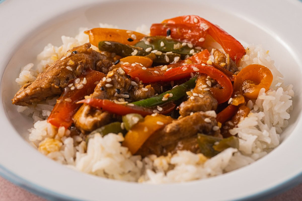 This easy version of pork tenderloin stir fry is made with tender slices of pork and tri-color bell peppers. They are quickly sauteed and then a flavorful, savory sauce is added to the skillet. Dinner ready under 30 minutes!