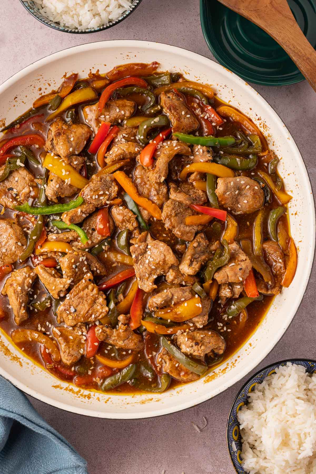 Leftover stir fry will keep in an airtight container in the refrigerator for 3-4 days. Reheat the pork and peppers with the sauce in a skillet over low heat, or in the microwave until warmed through, about 1-2 minutes. The sauce will have thickened as it got cold so you may add a bit more broth or water to thin it out.