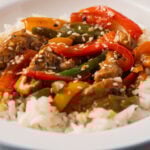 - Add pork and peppers to sauce and simmer with sauce for 2 minutes to heat through.