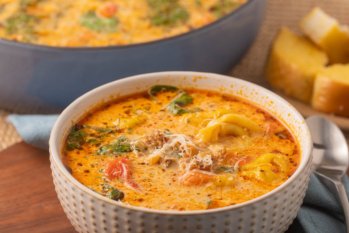 I like this soup because it has lots of flavor and doesn't need a long simmer on the stovetop. Browning the sausage with the onion creates a solid base, and cooking the tomato paste for a minute adds depth without making the soup taste tomatoey. The tortellini cooks right in the broth and adding the cream at the end keeps it smooth and creamy without overpowering the other flavors.